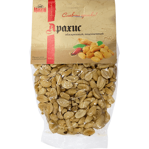 Обжаренный арахис с солью. Это питательный продукт, который поможет быстро утолить голод, и просто вкусный натуральный снек. А благодаря небольшой удобной упаковке, его можно взять с собой для перекуса на прогулке.