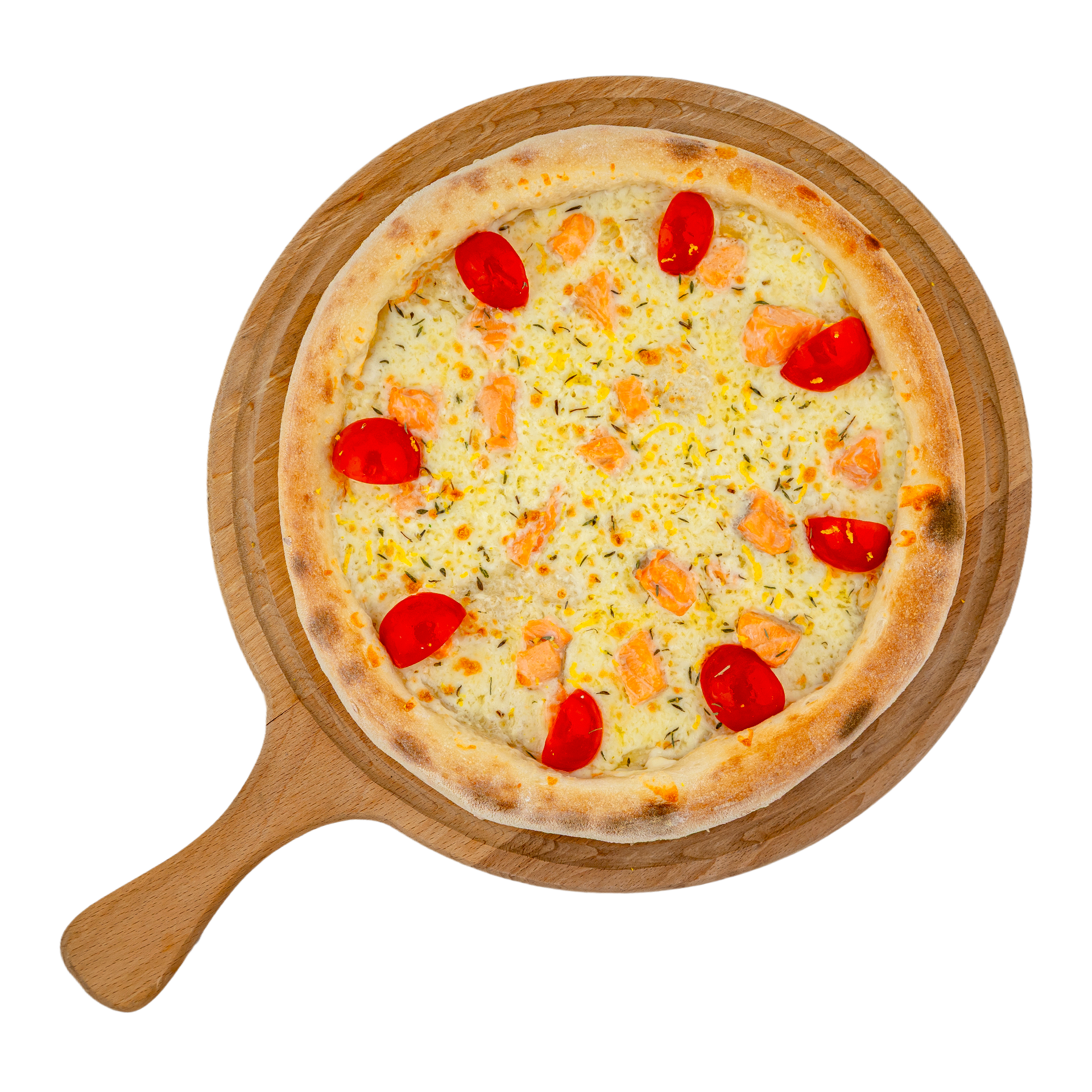 Свежий лосось, нежная моцарелла и сочные черри. Тимьян и лимонная цедра оттеняют вкус благородной рыбы. Пицца заправляется оригинальным сливочно-творожным соусом от шефа.