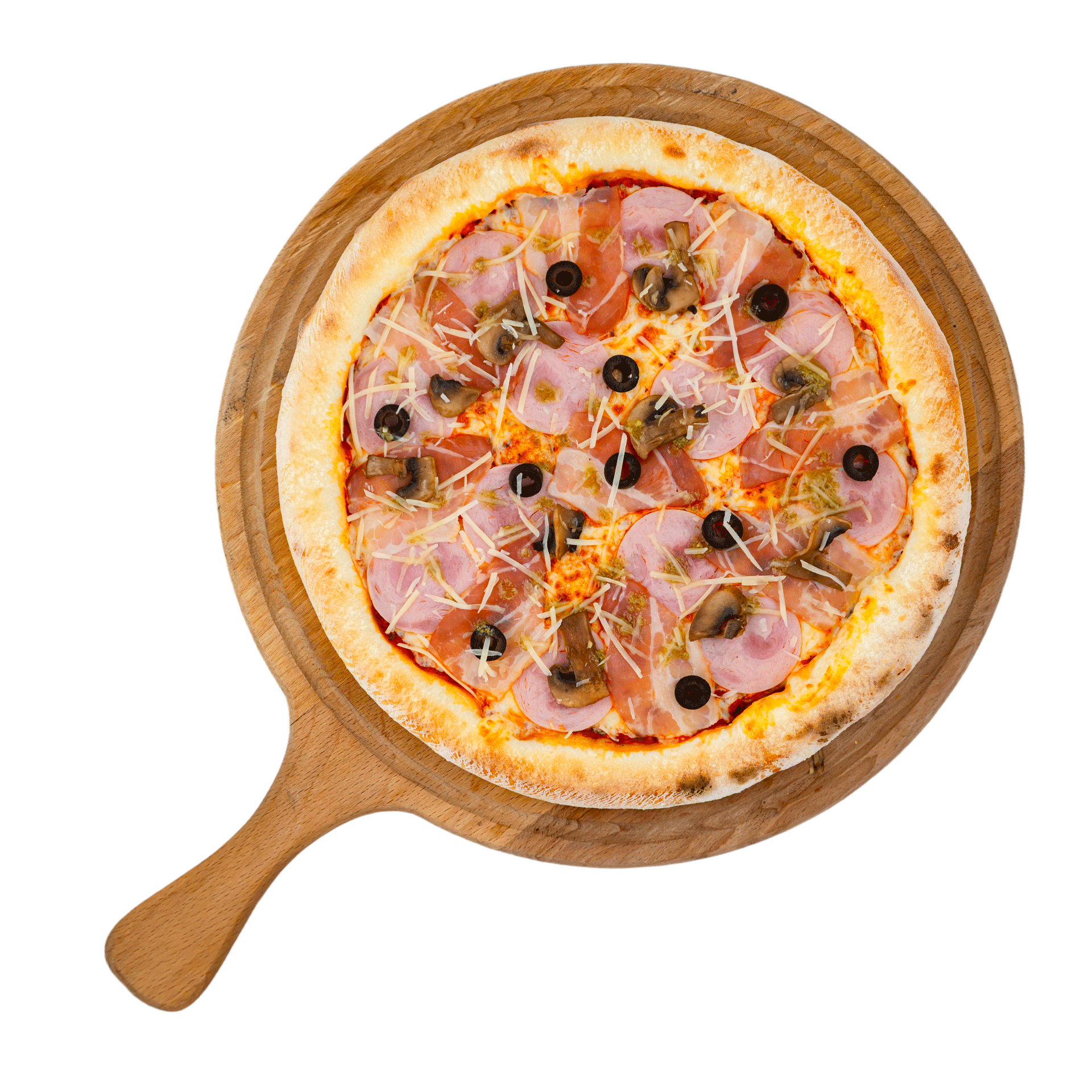 Бекон, ветчина, соус песто, шампиньоны, маслины, щедрая горсть моцареллы и томатный соус создают неповторимый вкус.Эта пицца не оставит равнодушным ни одного гурмана!