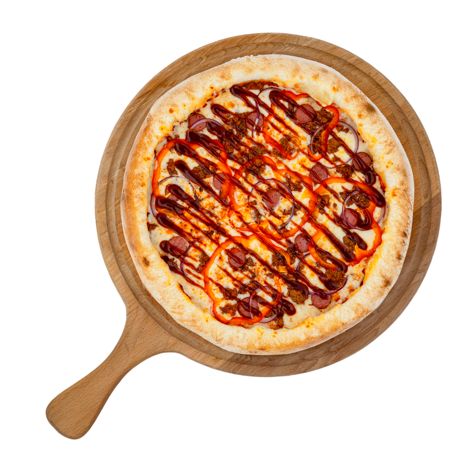 Тесто (мука, дрожжий, соль, сахар, вода, масло оливковое), томатный соус (томаты, соль, сахар, орегано, базилик, белый перец, масло оливковое), моцарелла, фарш болоньез (говядина, сельдерей, морковь, лук репчатый, томаты, тимьян, розмарин), колбаски охотничьи, помидор, лук красный, перец сладкий, соус барбекю.