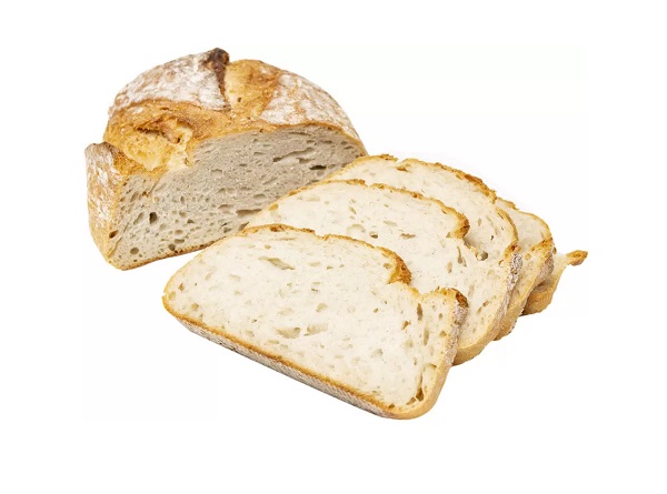Пшеничный воздушный хлеб длительной ферментации на закваске приготовлен из муки высшего сорта с хрустящей корочкой и пористым мякишем.