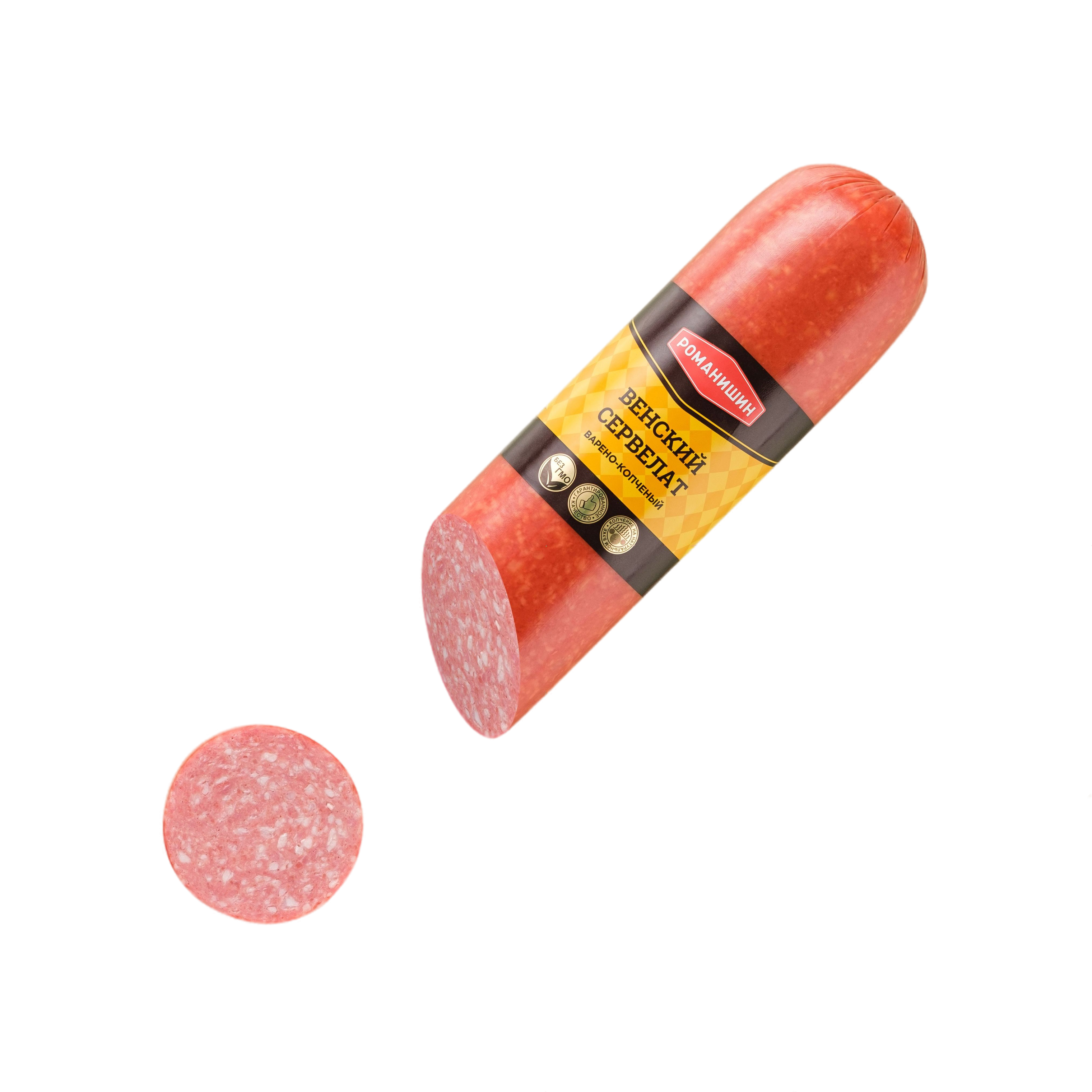 Венский сервелат отличает приятный розовый цвет, мелкая зернистость компонентов, нежная консистенция и яркие вкусовые характеристики. Основу продукта составляет филе цыпленка-бройлера. Благодаря чему он является особенно нежным. Мелко-зернистый рисунок на срезе создан мелким помолом хребтового шпика. Пряный изысканный аромат продукту придают мускатный орех и черный перец.