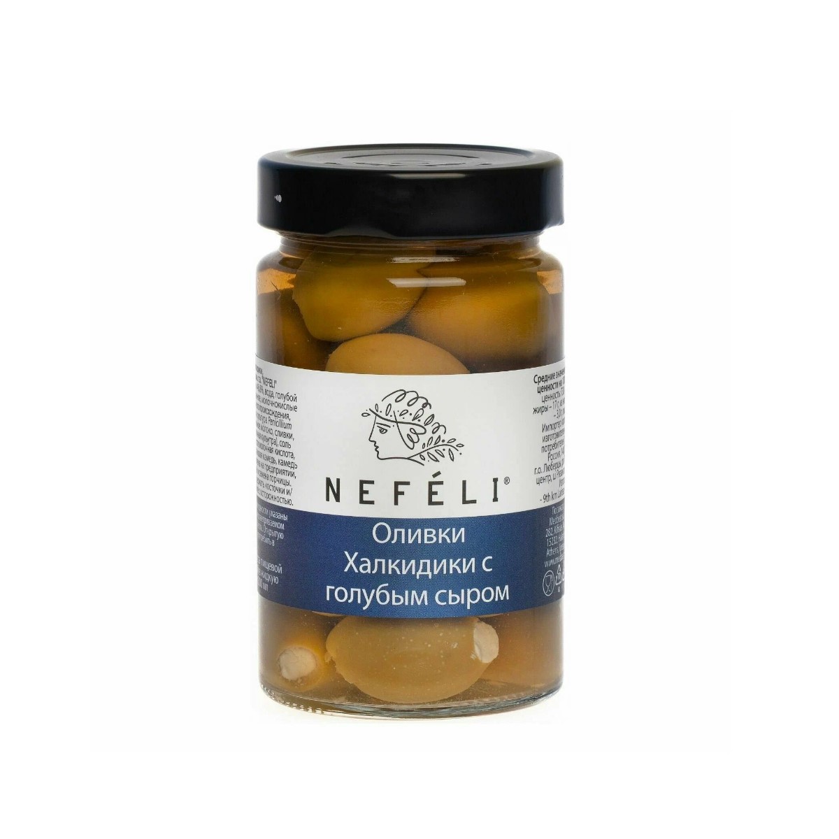 Оливки Халкидики без косточки, вода, голубой сыр (молоко коровье пастеризованное, сычужный фермент микробиального происхождения, плесневые грибы Penicilium Roqueforti), сливочный сыр (обезжиренное молоко, сливки, соль, молочнокислые бактерии), соль пищевая морская, регуляторы кислотности: молочная кислота, лимонная кислота, стабилизаторы: ксантановая камедь, камедь рожкового дерева.