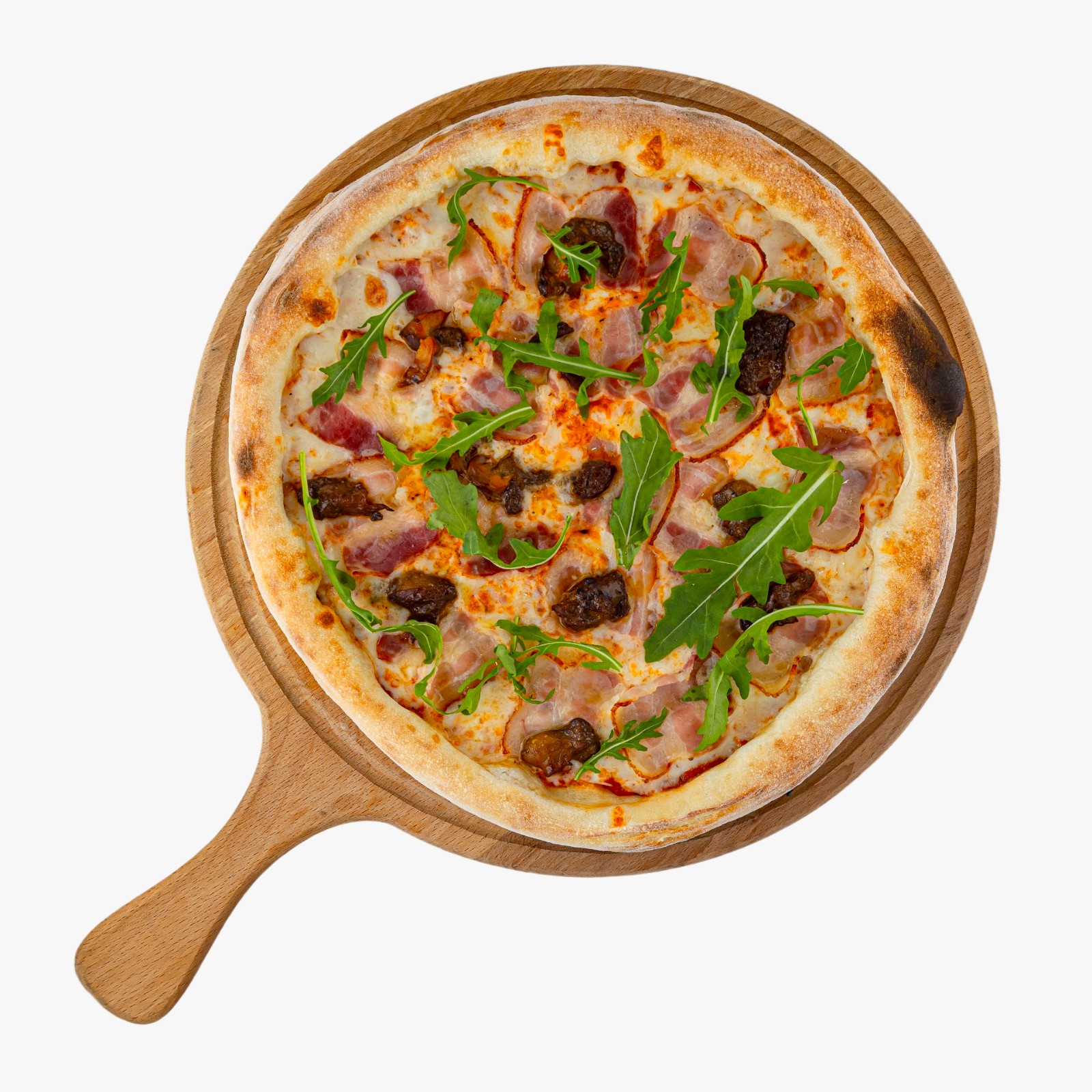 Тесто( мука, дрожжи, соль, сахар, вода, масло оливковое), томатный соус (томаты, соль, сахар, орегано, базилик, белый перец, масло оливковое), моцарелла, бекон, белые грибы, трюфельное масло, рукола.