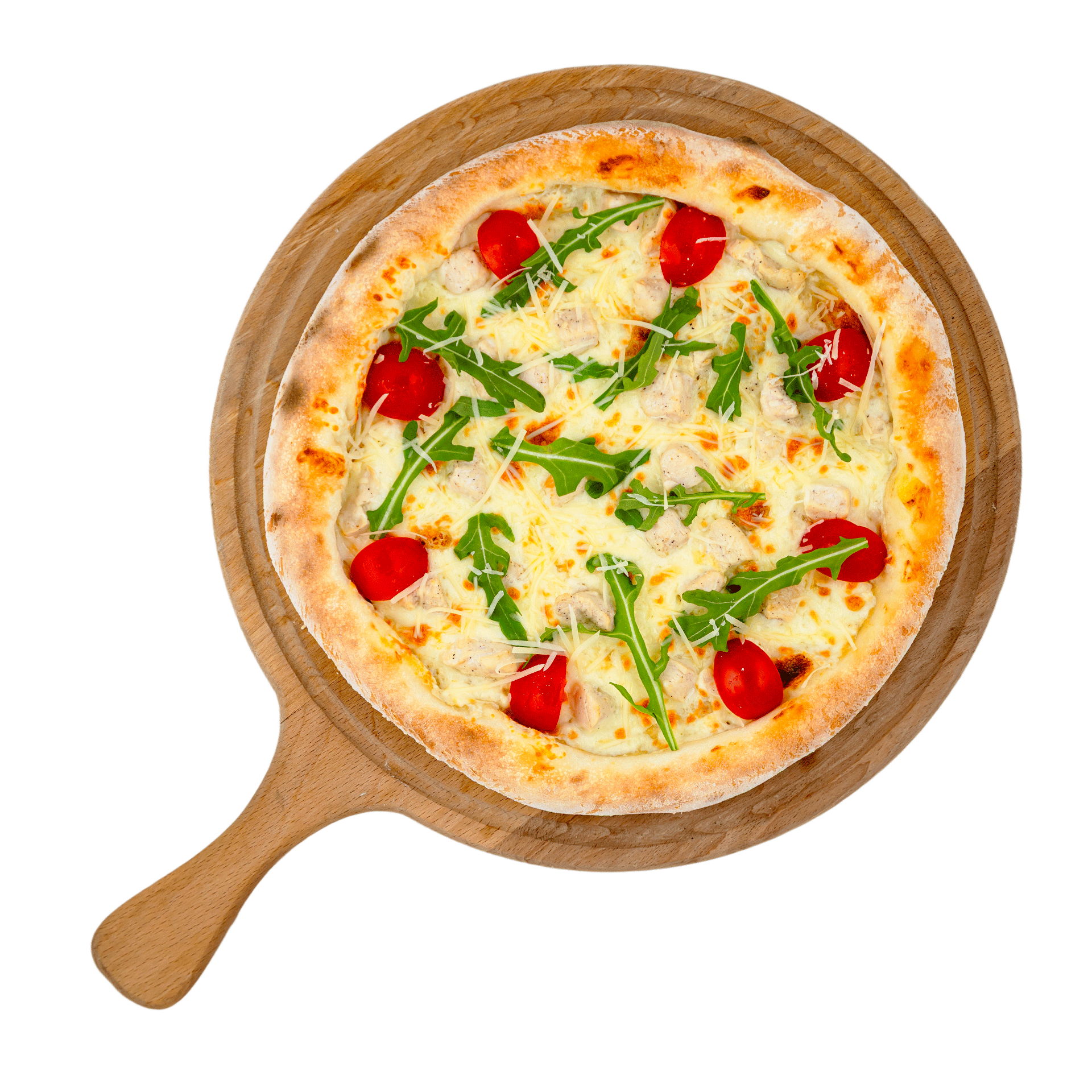 Пицца на тонком тесте «Цезарь» с курицей – это гармоничное сочетание хрустящей основы, сочных кусочков куриного филе, свежих листьев салата, томатов черри и нежного соуса «Цезарь». Завершается вкусная композиция ароматным сыром Пармезан. Легкая и изысканная пицца для тех, кто ценит классические вкусы с оригинальным акцентом!
