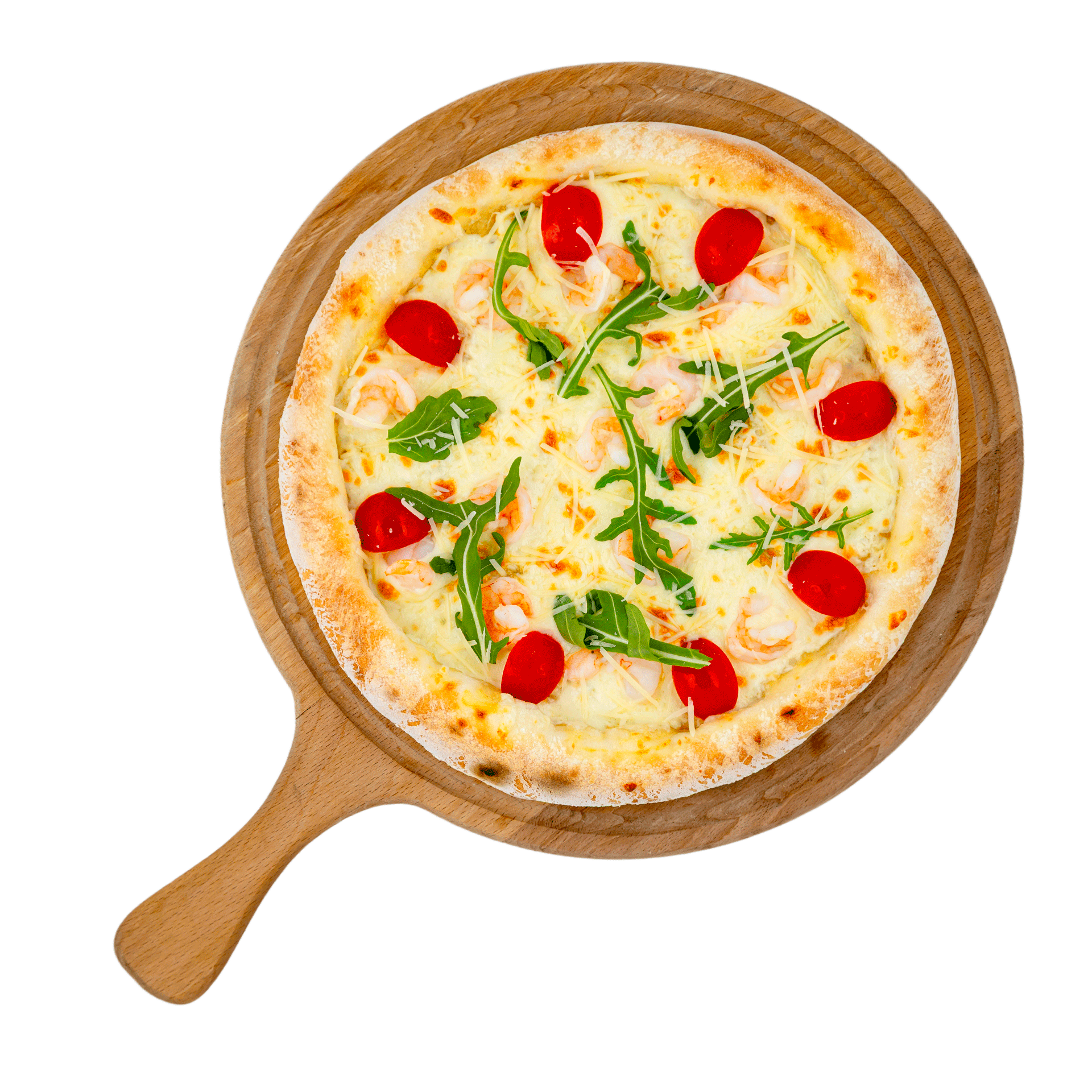 Тесто (мука, дрожжий, соль, сахар, вода, масло оливковое), соус цезарь (майонез, анчоусы, каперсы, хрен, горчица), моцарелла, креветки, черри, пармезан, рукола.