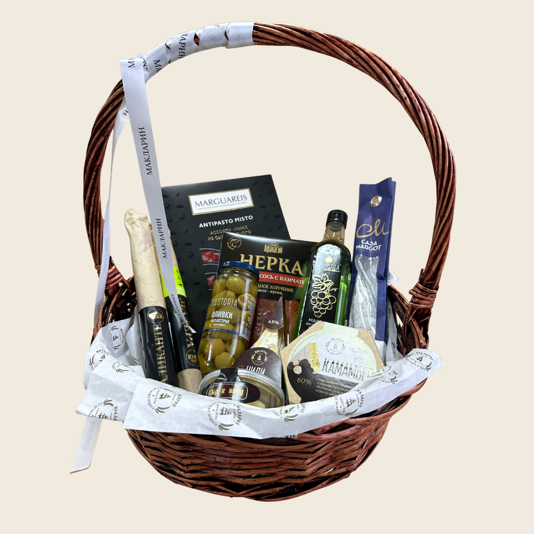 Колбаса Аликанте сырокопчёная Колбаса Мадера сырокопчёная Сыр полутвердый «Чили» м.д.ж. 45% 180 гр. Колбаса сыровяленая из зайца Casa Margot 200 гр. Сыр твердый к вину «Грюйер» 80 гр. Нерка холодного копчения филе 200 гр. Сыр мягкий «Камамбер» с черным трюфелем 120 гр. Продукт мясной из сыровяленного мяса «Сет MARGUARES» 60 гр. Оливки gustoria зелёные без косточки Масло виноградной косточки «GUSTORIA» 500 мл. ТУРЦИЯ Корзина большая