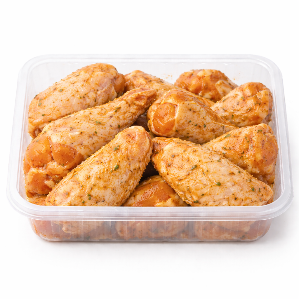 Мы используем отборные куриные крылья с естественной сочностью, богатые белком и сохраняющие мягкость при приготовлении. Мягкий маринад раскрывает вкус мяса и делает его особенно нежным.