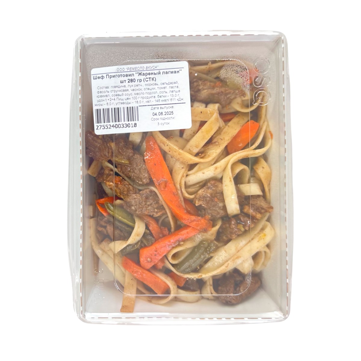 Говядина, лук репчатый, морковь, сельдерей, фасоль стручковая, чеснок, специи, томатная паста, крахмал, соевый соус, масло подсолнечное, соль, лапша удон. Условия хранения: t +2+4. Пищевая ценность в 100 г продукта: белки - 13,0 г, жиры - 8,0 г, углеводы - 18,0 г, кал - 146 ккал/ 611 кДж.